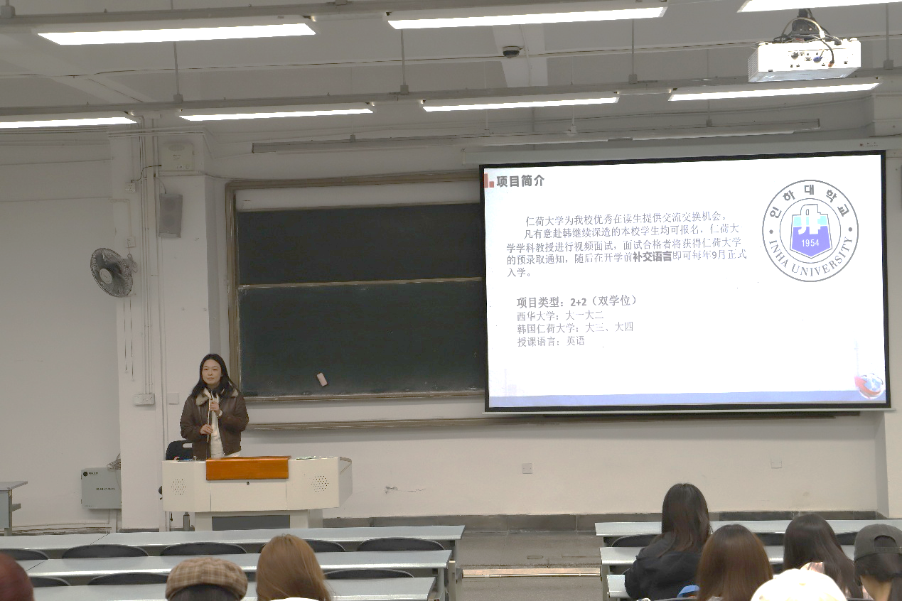 宣讲会上,负责老师首先聚焦韩国留学项目,西华大学已为学子对接韩国多所顶尖院校。随后,老师介绍了西华大学对接的日本留学双项目——日本国立大学硕博项目与SG30全英语授课项目。作为日本政府主办的院校项目,该项目优势显著:签证办理流程简便,学费低廉且设有丰富奖学金,学历受全球认可。之后,曾在留学项目中表现优异的毕业生们分享了他们在留学过程中的体会,以及对学弟学妹的建议。
