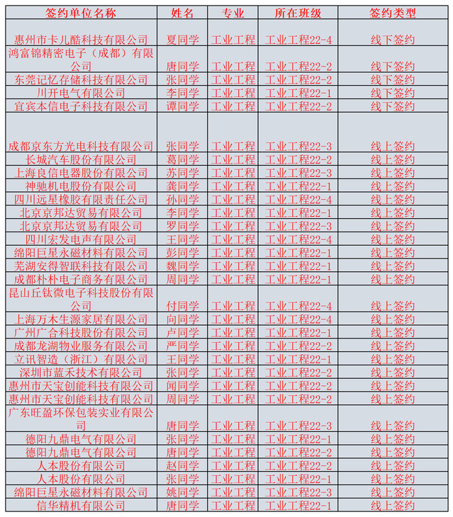 喜报-西华大学管理学院工业工程专业2026届毕业生签约喜报(1期)