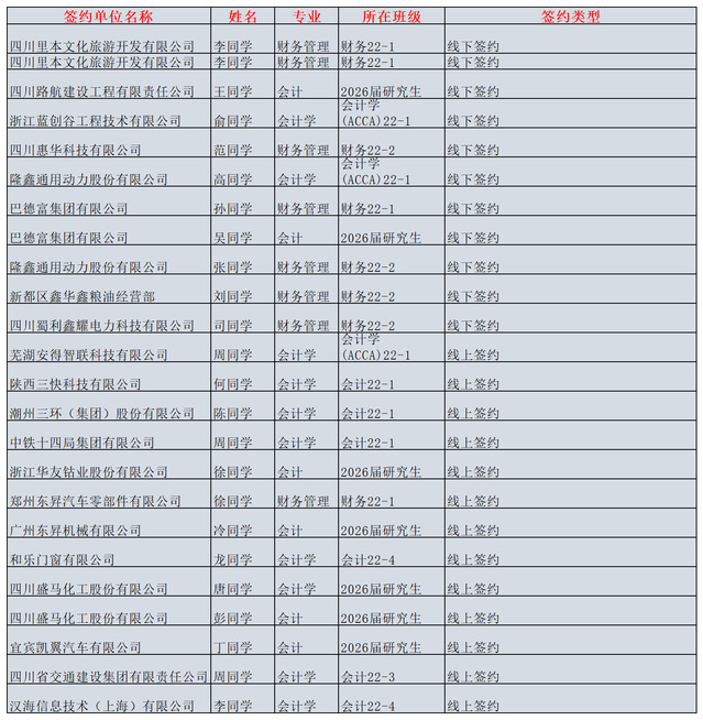 签约喜报-西华大学管理学院会计学、财务管理专业2026届毕业生签约喜报(1期)