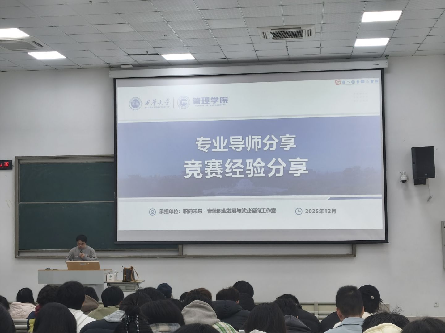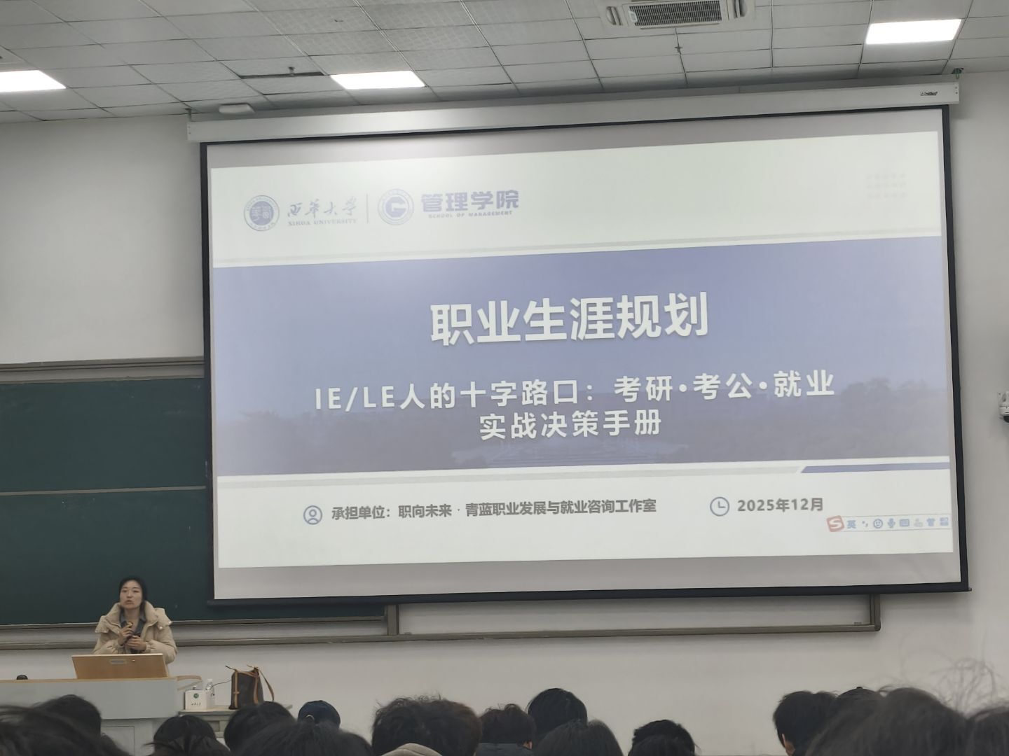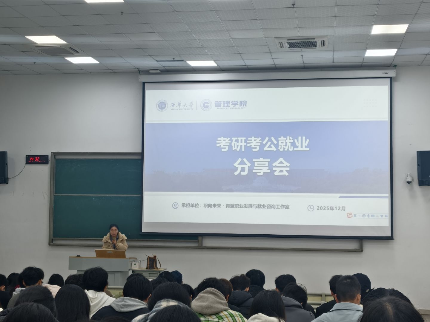 为展现升学就业多元路径,搭建师生经验交流平台,帮助学子明确发展方向,西华大学管理学院职向未来·青蓝职业发展与就业咨询工作室于2025年12月4日下午在宜宾校区1教112教室举办“考研考公就业分享会暨学习交流会”。活动汇聚优秀推免学子、专业导师与专职辅导员,带来了全方位、实战性的经验分享,为学子成长赋能。