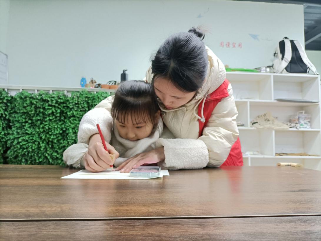 活动伊始,志愿者们与孩子们围坐成圈,以“汉字里的文化密码”为主题开启趣味分享。从“日”“月”等象形字的原始形态,到楷书的规范工整,再到汉字背后的历史典故与生活智慧,志愿者们用通俗的语言、生动的比喻,将抽象的汉字知识变得鲜活易懂。孩子们听得聚精会神,频繁举手分享自己的发现,在互动交流中拉近了与传统文化的距离。接着是书法教学环节,分为硬笔与软笔两部分。志愿者们先向孩子们展示了硬笔书法的基本笔法,讲解握笔姿势、坐姿的要领,再通过“横平竖直”简单口诀,引导孩子们在田字格中练习基础笔画和常用汉字;软笔教学区里,志愿者们提前铺好毛毡、备好笔墨纸砚,耐心示范蘸墨、运笔的技巧,从“一”“二”“十”等简单汉字入手,手把手指导孩子们感受毛笔的柔软与力度变化。书法练习结束后,志愿者们带着孩子们来到社区的开阔场地,开展了一场充满活力的“汉字接力大挑战”——志愿者们将孩子们分成两组,每组依次派出一名小朋友,由志愿者说出一个汉字的笔画顺序或象形含义,孩子需要在30秒内用身体摆出对应的笔画形状,让同组伙伴猜出这个汉字,孩子们在小院里跑跳着、比划着,志愿者们在一旁笑着引导,小院里满是孩子们的笑声和喊出答案的欢呼声。