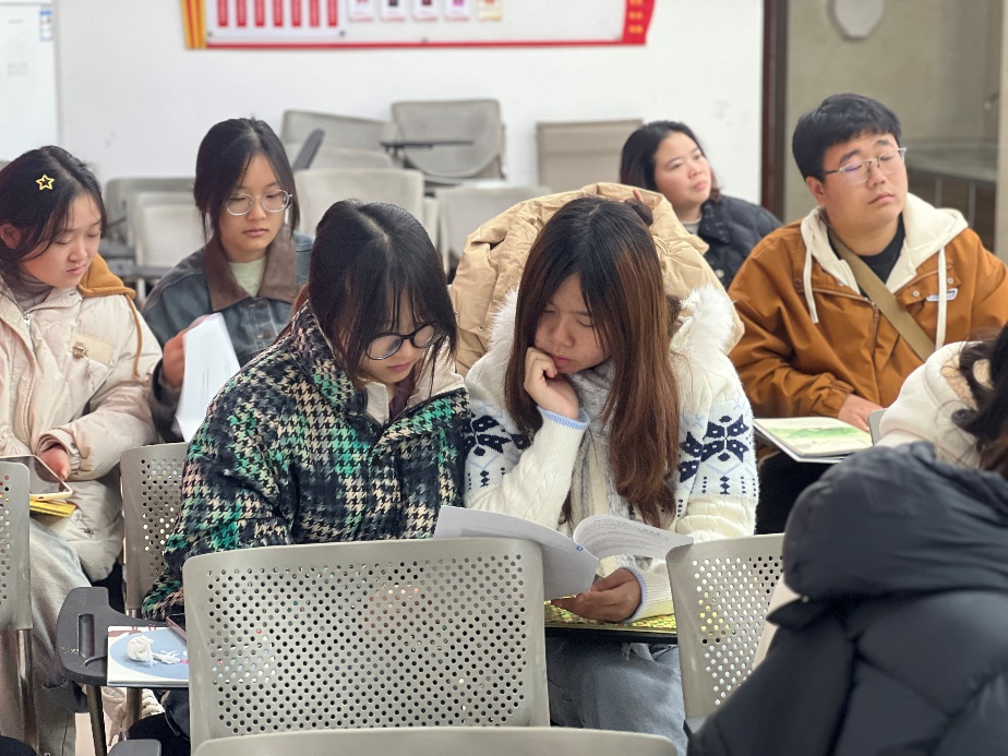 培训伊始,小屋负责人锚定了服务的核心:这里的主角是社区低龄儿童,志愿者的任务不只是“看顾”,更是以书为桥梁,搭建起进入孩子们世界的通道,而“耐心蹲下来、细心听进去、责任心扛起来”,正是让这场书香志愿落地的关键。紧接着,往期优秀志愿者代表把服务经验融入到具体的书屋日常里:比如书架上的绘本该怎么摆放,才能让孩子踮起脚就能拿到喜欢的书;遇到坐不住的小朋友,不用急着“规训”,可以顺着他们的注意力,从绘本里的插画聊起,慢慢把兴趣引到故事里;要是碰到孩子突然闹情绪,先递上一本色彩明亮的小书、再轻轻拍着背安抚,比反复劝说更能让孩子平静下来。这些接地气的分享,让志愿者们彻底放松下来,大家自然地围坐成圈,就“如何不打扰孩子自主翻书又能提供帮助”“怎样引导内向孩子参与共读”等问题交流探讨。现场氛围热烈鲜活,大家以手边绘本为载体模拟伴读场景,轻快的朗读声与贴合情节的表情动作相映成趣。