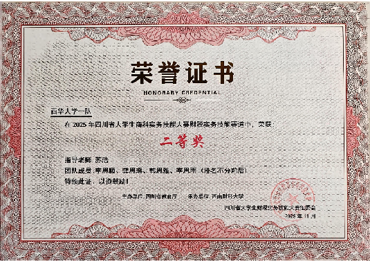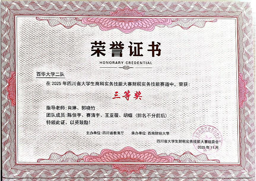 2025年四川省大学生财税实务技能大赛圆满落下帷幕。由西华大学管理学院学子组成的参赛队伍,在全省高校代表队中脱颖而出,一举斩获团队二等奖、团队三等奖,为学校在该赛事的历史上再添上浓墨重彩的一笔。