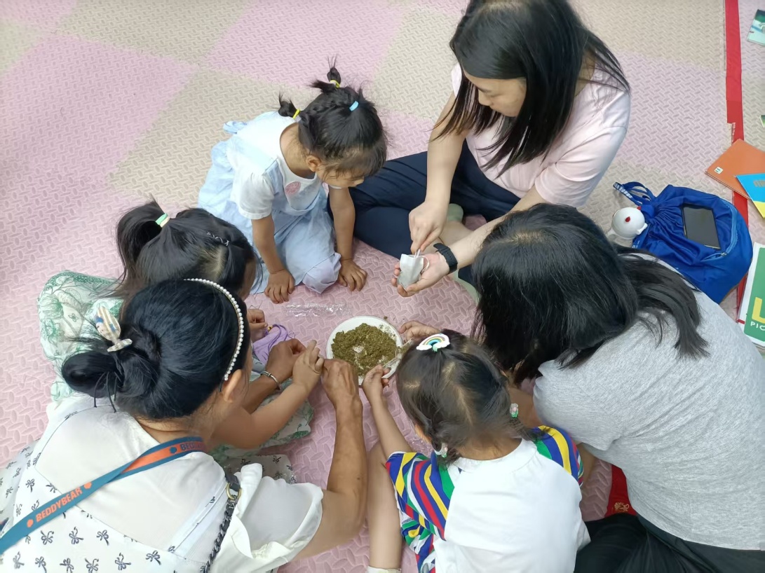 活动伊始,志愿者们围坐在粉色地垫上,用生动有趣的语言为孩子们讲述端午节的故事——从屈原的爱国情怀,到龙舟竞渡、端午食粽的由来,孩子们睁着好奇的眼睛,时不时举起小手提问,在一个个小故事里感受着传统文化的温度。在艾草香包制作环节,志愿者们先向孩子们展示了提前准备好的香包样品,又耐心讲解了艾草驱虫避瘟的作用。地上的白色小碗里盛着干燥的艾草,旁边摆放着彩色的布料、流苏,孩子们在家长的协助下,小心翼翼地将艾草装进布袋,用细绳系紧,再挂上漂亮的流苏,不一会儿,一个个小巧玲珑、带着淡淡草药香的香包就握在了孩子们的手里。有的孩子举着自己做的香包凑近鼻尖轻嗅,有的则迫不及待要把这份“端午礼物”送给身边的爸爸妈妈,活动室里满是艾草的清香和孩子们的笑声。