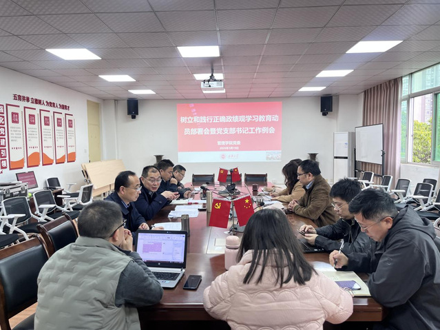 3月19日上午,管理学院党委召开树立和践行正确政绩观学习教育动员部署会暨党支部书记工作例会,部署安排树立和践行正确政绩观学习教育。会议由学院党委书记胡伟主持,班子成员、党委委员、党支部书记、系(室)中心主任参加会议。