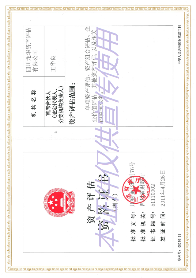 四川龙华资产评估有限公司系由成都伟龙资产评估事务所转换组织机制而来。成都伟龙资产评估事务所于2000年1月经原四川省国有资产管理局以川资评管(2000)51号文批准改制设立。四川龙华资产评估有限公司经四川省财政厅颁发“川财审批[2011]5号”批准,成立于2011年9月,同时取得资产评估资格证书,证书编号为51110002。公司注册资本100万元人民币,法定代表人:王华良,公司住所:成都市锦江区滨江西路8号2-2幢9楼3号。新办公地点为成渝立交旁万科金库II期617室,位于成华区万科路1号,其可用办公面积为150平方米。