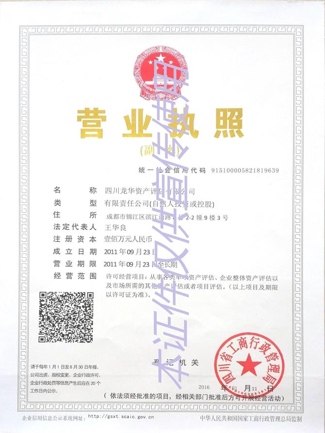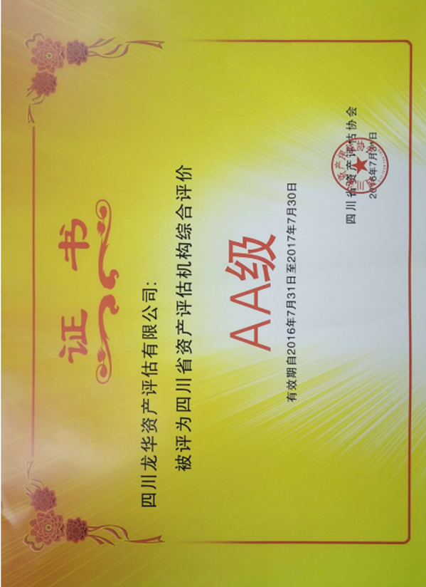 四川龙华资产评估有限公司是专职从事资产拍卖、转让、抵押、担保、中外合资(合作)经营及企业清算、兼并、出售、联营、股份经营、企业租赁等事宜中的各项资产评估业务,包括有形资产和无形资产,单项资产和整体资产;投资项目策划、可行性分析、法律、法规、政策咨询等业务。公司获得四川省资产评估协会颁发的2015年度、2016年度AA级信用评介证书。欢迎你们加入本公司。