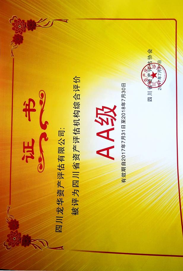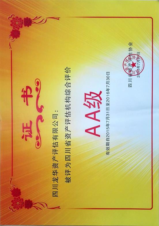 公司获得四川省资产评估协会颁发的2015-2017年度AA级信用评介证书;